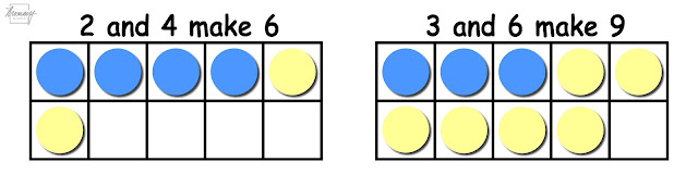 The next method is using ten frames and counters. Counters with different colors would make this easier off course. This helps to show how two numbers can make the whole number.